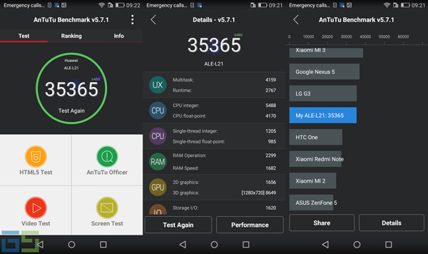حال نوبت آن رسیده تا قدرت این گوشی را توسط نرمافزارهای بنچمارک محک بزنیم. در بنچمارک سیستمی Antutu کسب نتیجه 35365 برای یک گوشی با این ردهی قیمتی خارقالعاده است! برای درک بیشتر قدرت P8 Lite کافی است بدانید این گوشی در این بنچمارک چسبیده به پرچمدار سال گذشته الجی یعنی G3 قرار گرفته است.