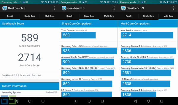 در دیگر بنچمارک مطرح یعنی GeekBench3.0 امتیاز کسب شده برای این گوشی در بخش تک هستهای 556 و در بخش چند هستهای 2714 به ثبت رسیده که مقادیری کاملاً رضایتبخش است.