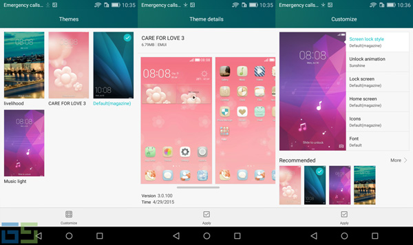 همچنین در نسخه جدید رابط کاربری EMUI امکان دانلود و تعویض تم وجود دارد. در این تمها تصویر پس زمینه اصلی و صفحه قفل، آیکونها و حتی افکتهای گرافیکی حرکت در بین منوها نیز قابل تغییر است.