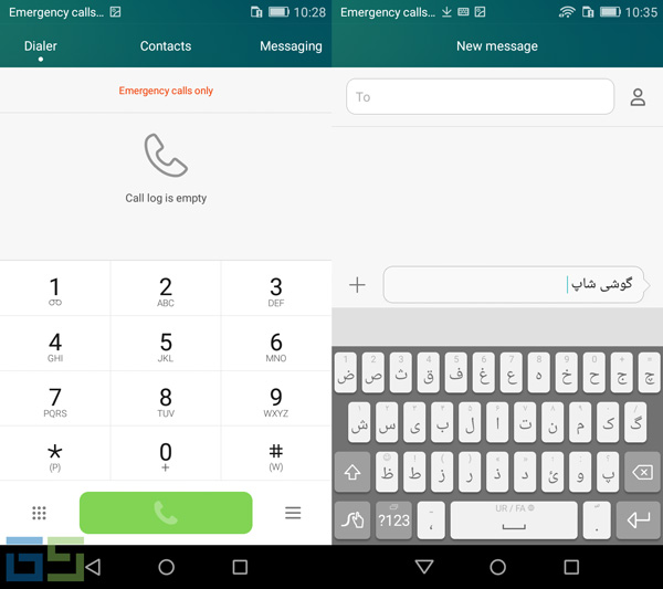 منوی تماس و ارسال پیامک بسیار ساده و شبیه به رابط کاربری در اندروید 5.0 خام هستند. در P8 Lite امکان فارسی کردن منوها و تایپ به زبان فارسی نیز فراهم است.