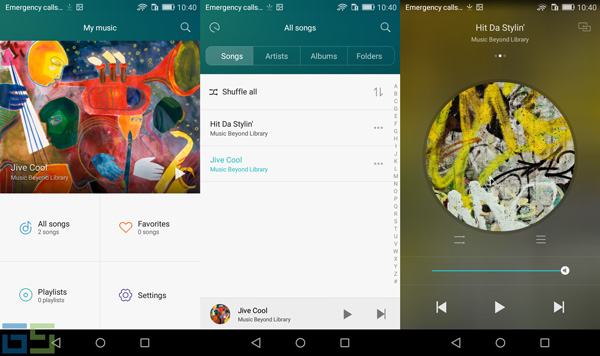 نرمافزار پخش کننده موسیقی در P8 Lite نیز بسیار شبیه به پلیر پیش فرض اندروید یا همان Play Music است، با این تفاوت که امکان دسترسی به آهنگها در پوشهها نیز امکانپذیر است.