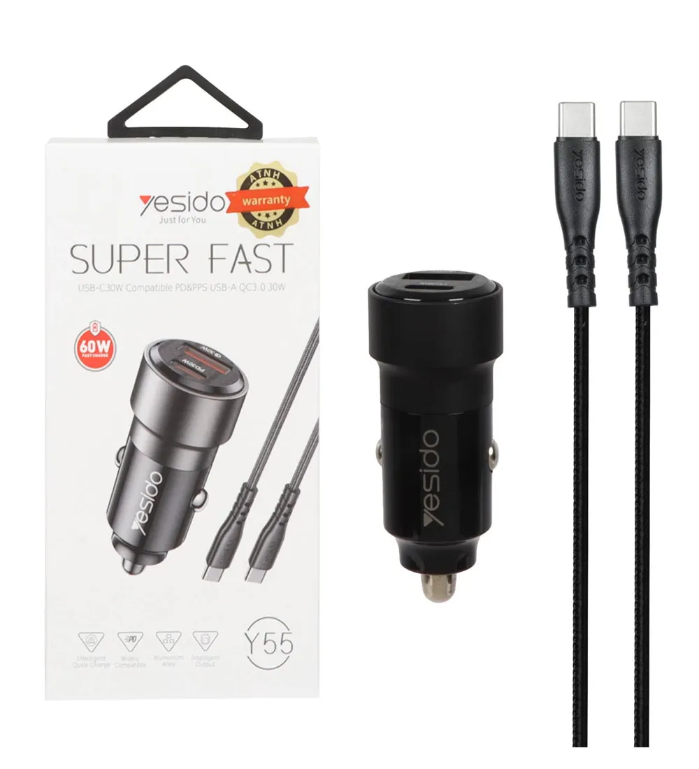 شارژر فندکی یسیدو مدل Y55 توان 60 وات همراه با کابل شارژ تایپ سی