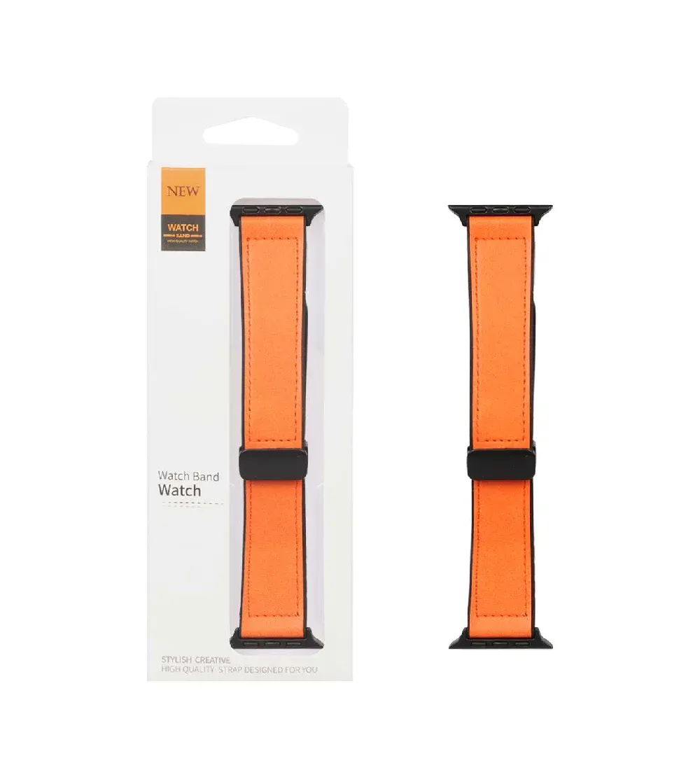 تصویر  بند اپل واچ 42/44/45/49 میلی متری چرمی دور دوخت پشت سیلیکون مگنتی - نارنجی