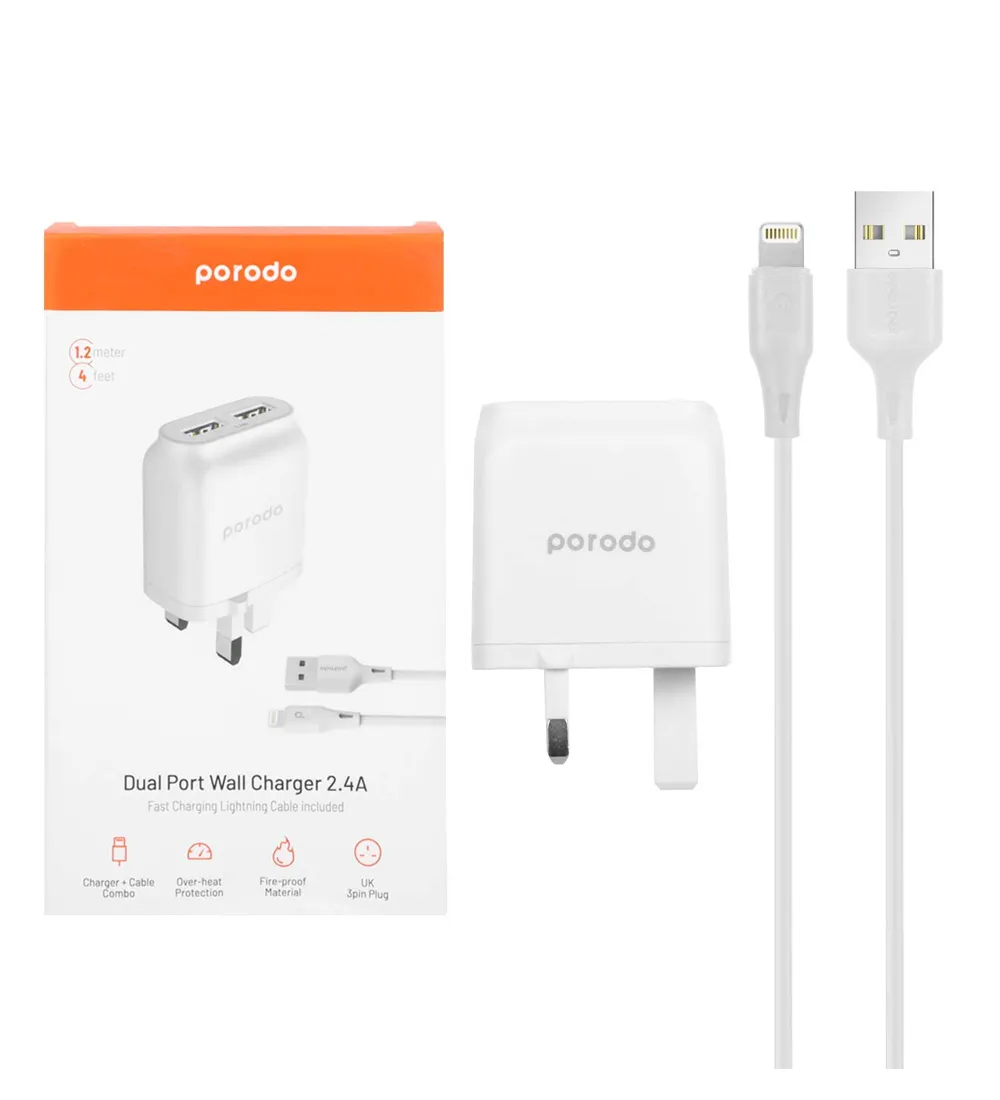 Porodo PD-0203LU2-WH 12W 2 Ports with Lightning Cable Wall Charger