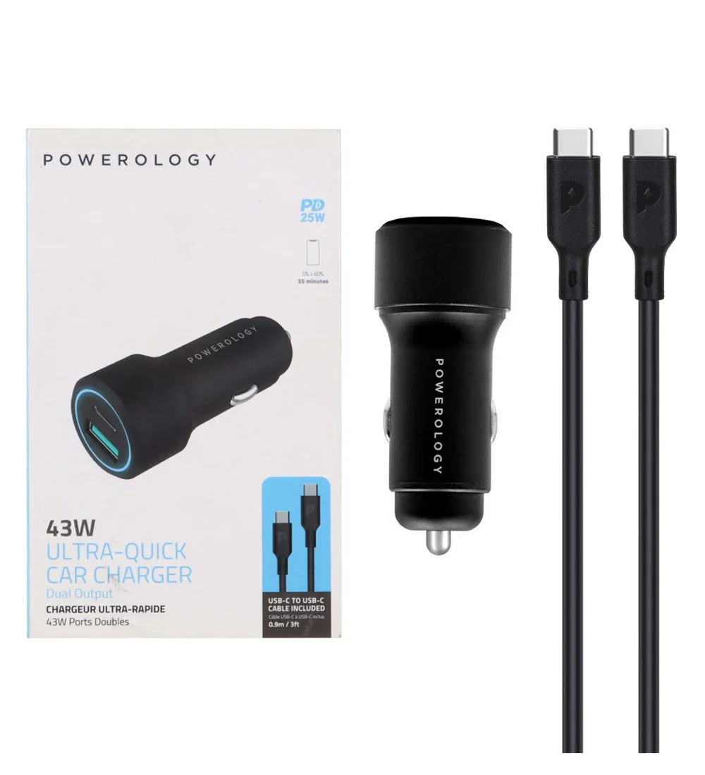 Powerology PQCPDCCC 43W Fast and PD 2 Ports with Type-C To Type-C Cable Car Charger