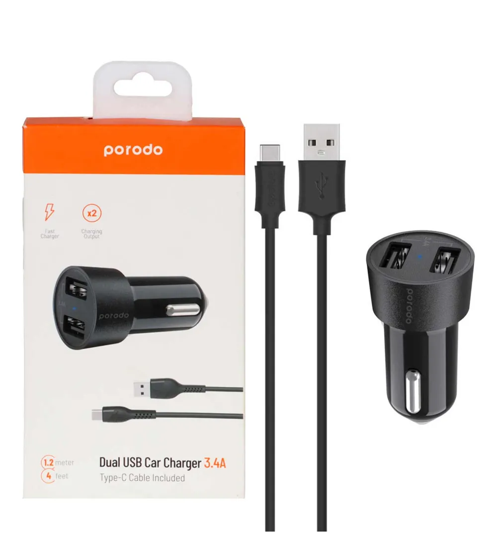 Porodo PD-M8J622t 2 Ports Fast with Type-C Cable Car Charger