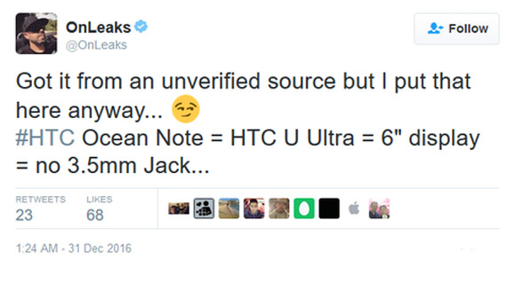 بد نیست بدونید که اوایل ماه گذشته میلادی دعوتنامه هایی مربوط به یک رویداد خبری در روز 12 ژانویه 2017 (23 دی ماه) از سوی شرکت اچ تی سی فرستاده شد و از طرفی حدود سه ماه پیش درباره ایده جدید HTC که Ocean نامیده می شه، چیزهایی شنیدیم؛ حال بنابه توییتی که توسط کاربر مشهور @OnLeaks در توییتر منتشر شده، گوشی HTC Ocean Note در حقیقت همون HTC U Ultra ست.