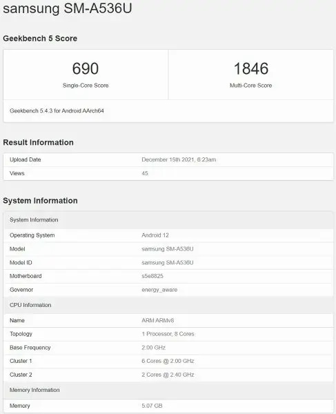 با نزدیک شدن به تاریخ رونمایی از گلکسی ای 53، هر روز شاهد انتشار اخبار بیشتری از این گوشی هستیم و حال در جدیدترین اطلاعات مربوط به این گوشی، مشخصات کلیدی «گلکسی ای 53 فایو جی» توسط Geekbench فاش شد؛ ساعاتی قبل گوشی هوشمندی با شماره مدل SM-A536U منتسب به گلکسی A53 5G در بنچمارک گیکبنج رویت و برخی مشخصات کلیدی اون فاش شد.